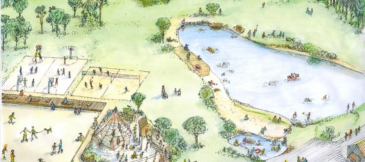 Leider ging es dann nicht weiter für uns. Auch, wenn das Auswahlgremium von unseren Ideen begeistert war, so waren wir doch leider zu teuer. Da ich immer vor Ort entwerfe und es mir in diesem Fall besonders viel Freude gemacht hatte, schaute ich ab und an mal in die Zeitung, was da so vor Ort passiert. Und siehe da: ein knappes Jahr später war plötzlich von einem Naturbadpark oder eines Natursportparks zu lesen – siehe da! Nun war ich doch etwas verwundert. Da ich das Berliner Büro, was den Auftrag erhalten hat, kenne und die dort zuständige Partizipationsbeauftragte in einem Workshop von mir gewesen war, rief ich sie einfach mal an.