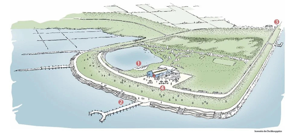 Die Neugestaltung der Dockkoggspitze nimmt das ambivalente Verhältnis der Husumer*innen mit dem Meer konstruktiv auf. Im Winter kann das Gelände schadlos von Stürmen überschwemmt werden – im Sommer lädt die Promenade zum Flanieren ein. Die Wiese bietet geschützte Nischen zum Sonnetanken und als Herzstück erlaubt ein Meerwassersee Badevergnügen ganz unabhängig von Ebbe und Flut. Auf dem Wasserspielplatz können Kinder das nasse Element spielerisch für sich entdecken und eine schwimmende Bühne an der Promenade macht Kultur auf dem Wasser möglich. Die Dockkoogspitze wird zum Mittler zwischen Land und Meer, zu einem Begegnungsort.