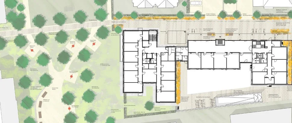 Ein notwendig gewordener Erweiterungsbau des Bürogebäudes des BVOs in Oldenburg brachte die Möglichkeit mit sich, durch entsprechende Gestaltung der Freiflächen einen Begegnungsort für die Mitarbeiter*innen des BVOs und Gäste zu schaffen, eine angemessene Repräsentation des BVOs durch entsprechende Außenraumgestaltung zu fördern und einen optischen Zusammenschluss mit dem durch den BVO verwalteten und unmittelbar angrenzenden Gertrudenheim zu erreichen.